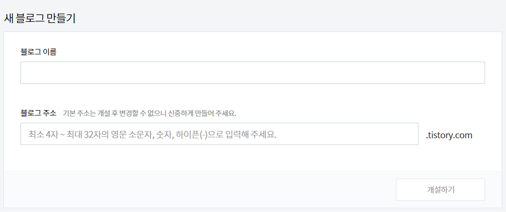 여기서 운영할 블로그의 이름과 주소를 입력하신 후 [개설하기] 버튼을 누르면 끝!입니다.